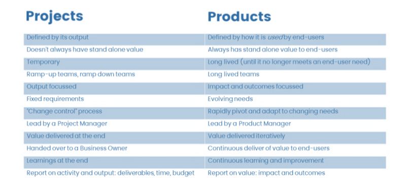 Move from Project way of working to Product approach looks trivial but during last months I discovered it is not. There are a lot of things that are different: the horizon/time, the funding, skills, the way of working, the mindset…